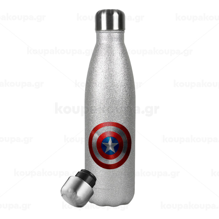 Captain America, Metallic Glitter Silver Thermos Flask (Stainless steel), double-walled, 500ml