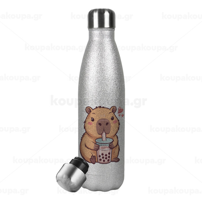 Capybara Bubble Tea, Metallic Glitter Silver Thermos Flask (Stainless steel), double-walled, 500ml