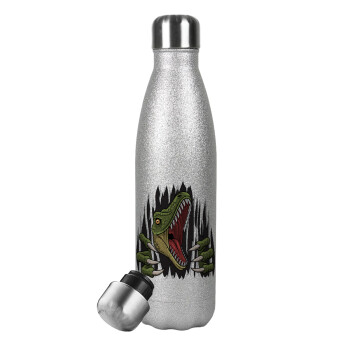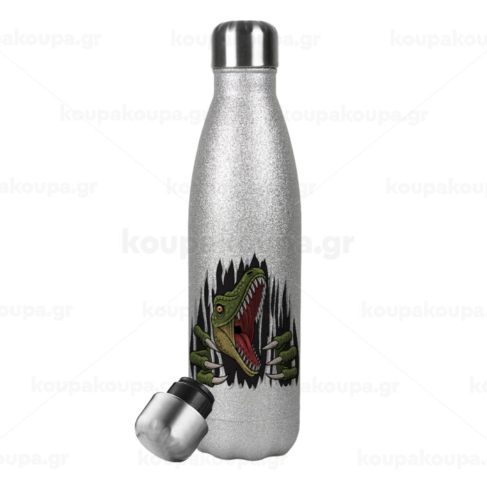 Dinosaur scratch, Metallic Glitter Silver Thermos Flask (Stainless steel), double-walled, 500ml