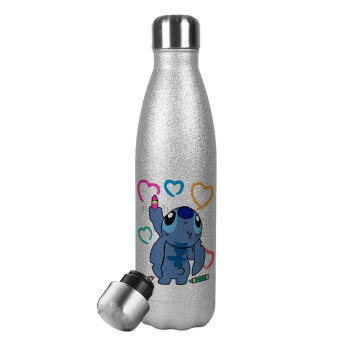 Lilo & Stitch painting, Metallic Glitter Silver Thermos Flask (Stainless steel), double-walled, 500ml