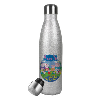 Peppa pig Family, Metallic Glitter Silver Thermos Flask (Stainless steel), double-walled, 500ml