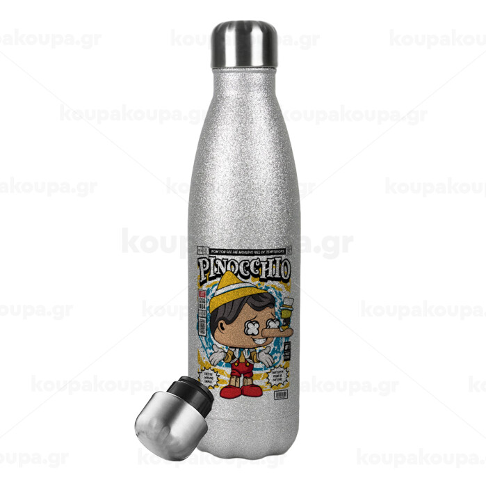 Pinocchio, Metallic Glitter Silver Thermos Flask (Stainless steel), double-walled, 500ml