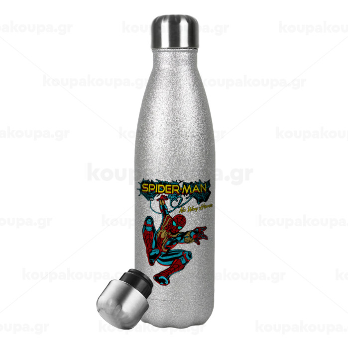 Spiderman no way home, Metallic Glitter Silver Thermos Flask (Stainless steel), double-walled, 500ml
