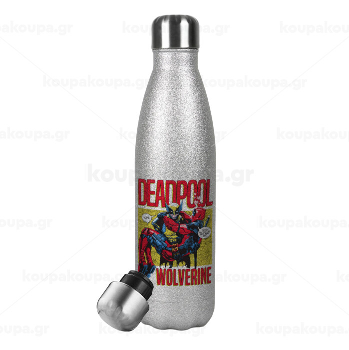 Superhero Deadpool Wolverine, Metallic Glitter Silver Thermos Flask (Stainless steel), double-walled, 500ml