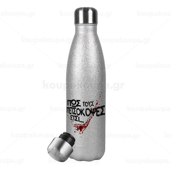 Πως τους πετσόκοψες έτσι..., Metallic Glitter Silver Thermos Flask (Stainless steel), double-walled, 500ml