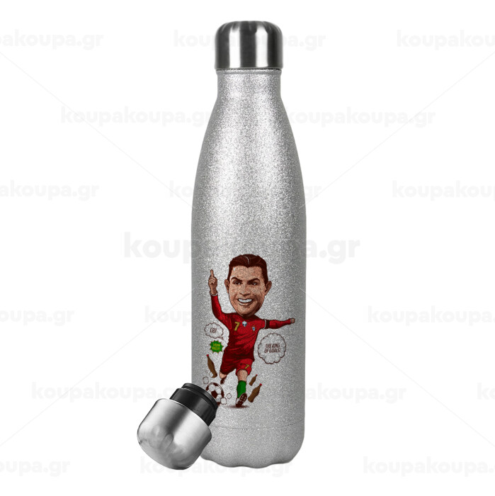 Cristiano Ronaldo, Metallic Glitter Silver Thermos Flask (Stainless steel), double-walled, 500ml