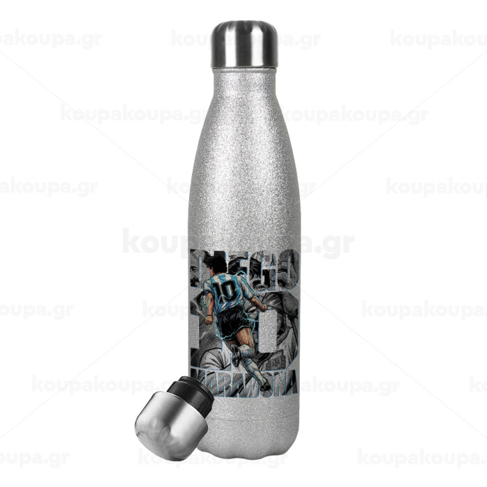 Diego Maradona (Ντιέγκο Μαραντόνα), Metallic Glitter Silver Thermos Flask (Stainless steel), double-walled, 500ml
