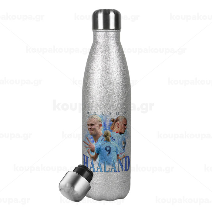 Erling Haaland, Metallic Glitter Silver Thermos Flask (Stainless steel), double-walled, 500ml