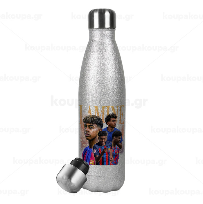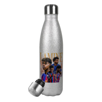 lamine yamal FCB, Metallic Glitter Silver Thermos Flask (Stainless steel), double-walled, 500ml