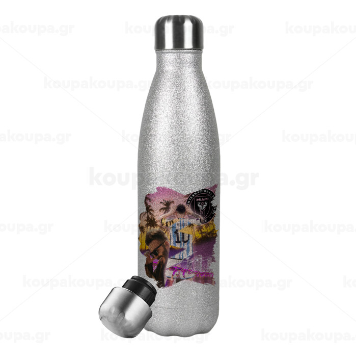 Lionel Messi Miami, Metallic Glitter Silver Thermos Flask (Stainless steel), double-walled, 500ml