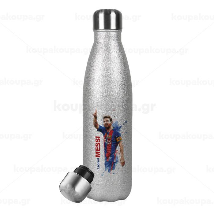 Lionel Messi, Metallic Glitter Silver Thermos Flask (Stainless steel), double-walled, 500ml