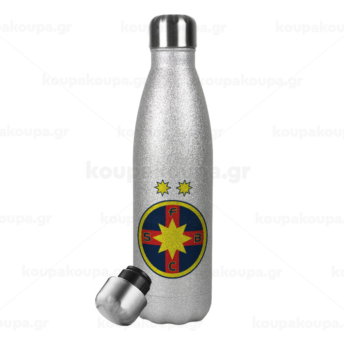FC Steaua Bucuresti (FCSB), Metallic Glitter Silver Thermos Flask (Stainless steel), double-walled, 500ml