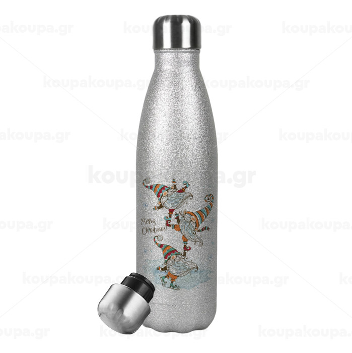 Christmas nordic gnomes, Metallic Glitter Silver Thermos Flask (Stainless steel), double-walled, 500ml