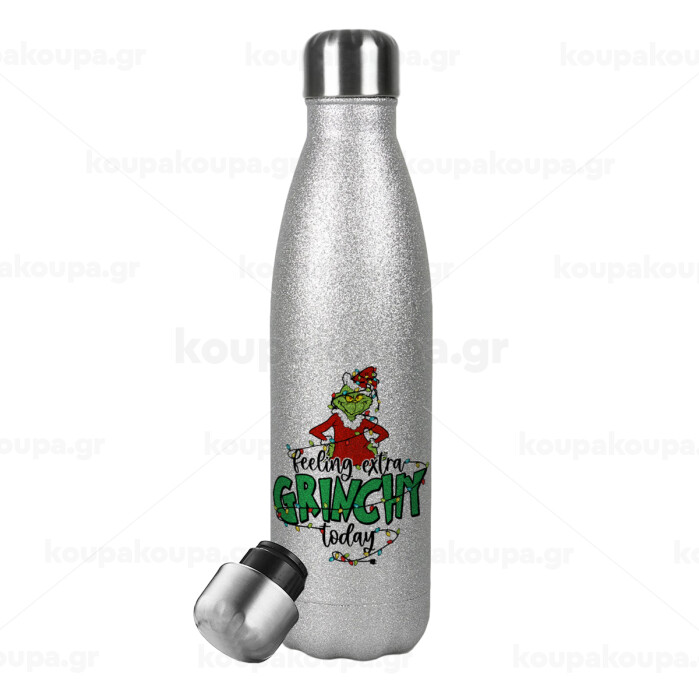 Grinch Feeling Extra Grinchy Today, Metallic Glitter Silver Thermos Flask (Stainless steel), double-walled, 500ml