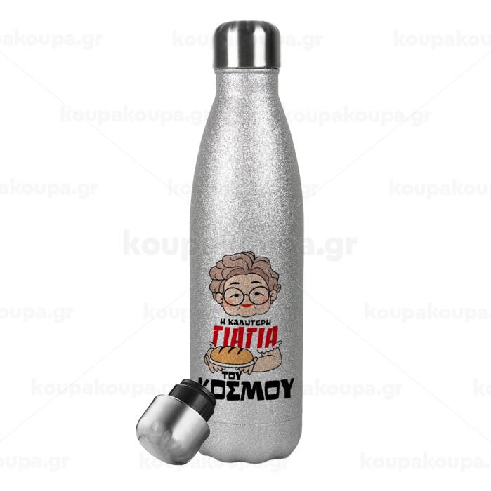 Η καλύτερη γιαγιά του κόσμου!, Metallic Glitter Silver Thermos Flask (Stainless steel), double-walled, 500ml