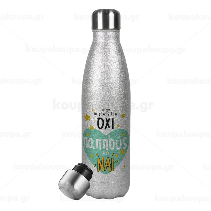 Όταν οι γονείς λένε ΟΧΙ, ο παππούς λέει ΝΑΙ, Metallic Glitter Silver Thermos Flask (Stainless steel), double-walled, 500ml