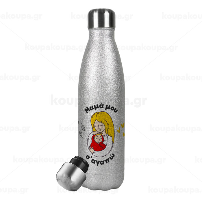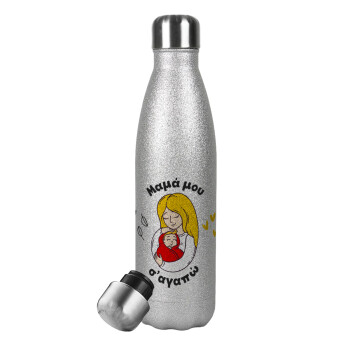 Μανούλα σ'αγαπώ αγκαλιά!, Metallic Glitter Silver Thermos Flask (Stainless steel), double-walled, 500ml