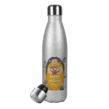 Cute mother reading book, happy mothers day, Metallic Glitter Silver Thermos Flask (Stainless steel), double-walled, 500ml