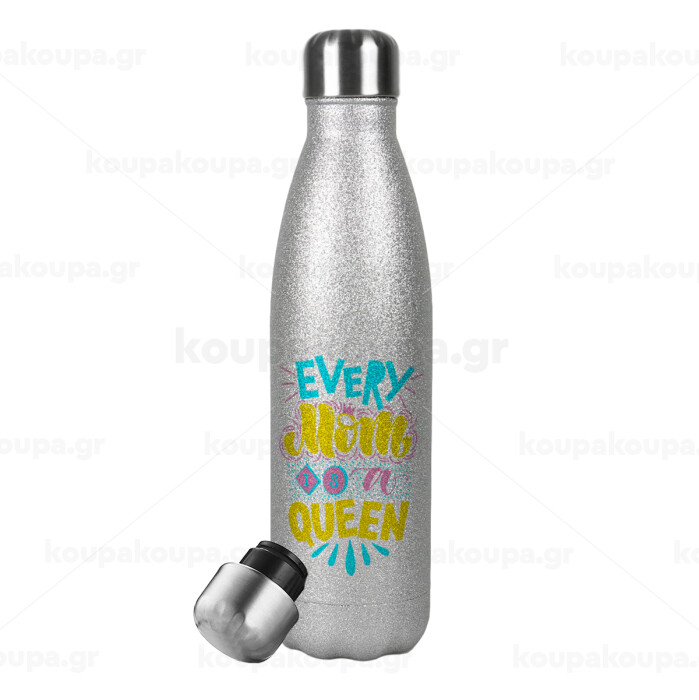 Every mom is a Queen, Metallic Glitter Silver Thermos Flask (Stainless steel), double-walled, 500ml