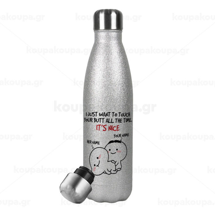 I Just Want To Touch Your Butt All The Time, Metallic Glitter Silver Thermos Flask (Stainless steel), double-walled, 500ml