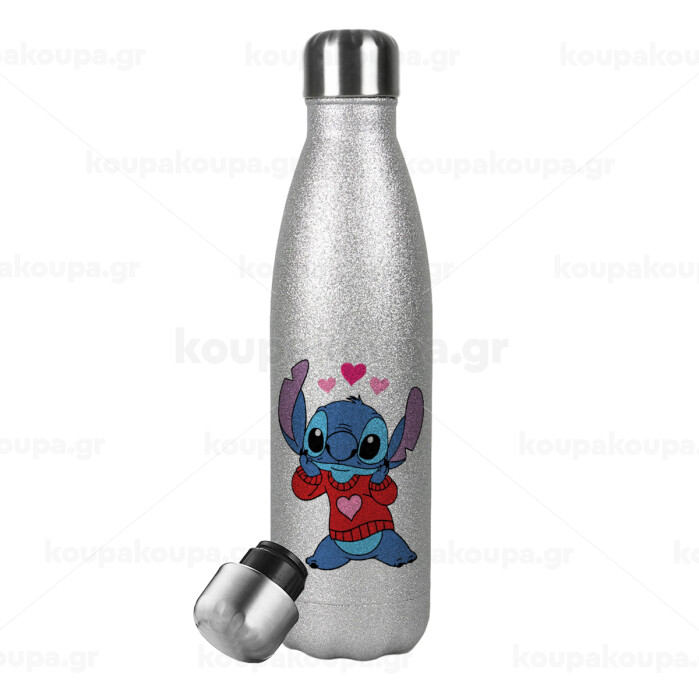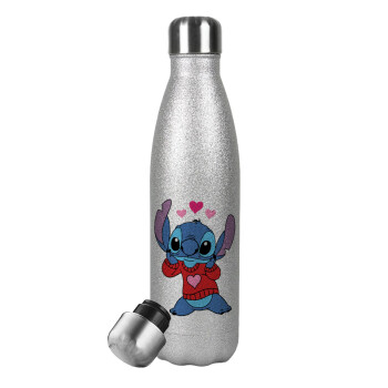 Stitch heart, Metallic Glitter Silver Thermos Flask (Stainless steel), double-walled, 500ml