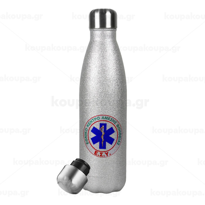 ΕΚΑΒ, Metallic Glitter Silver Thermos Flask (Stainless steel), double-walled, 500ml