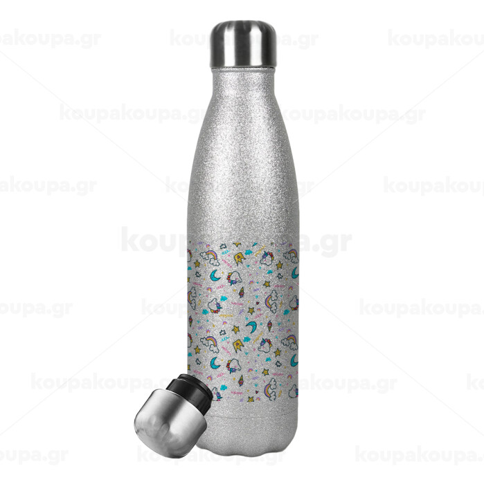 Unicorn pattern white, Metallic Glitter Silver Thermos Flask (Stainless steel), double-walled, 500ml