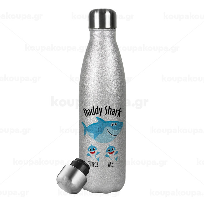 Daddy Shark (με ονόματα παιδικά), Metallic Glitter Silver Thermos Flask (Stainless steel), double-walled, 500ml