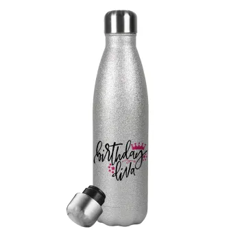 Birthday Diva queen, Metallic Glitter Silver Thermos Flask (Stainless steel), double-walled, 500ml