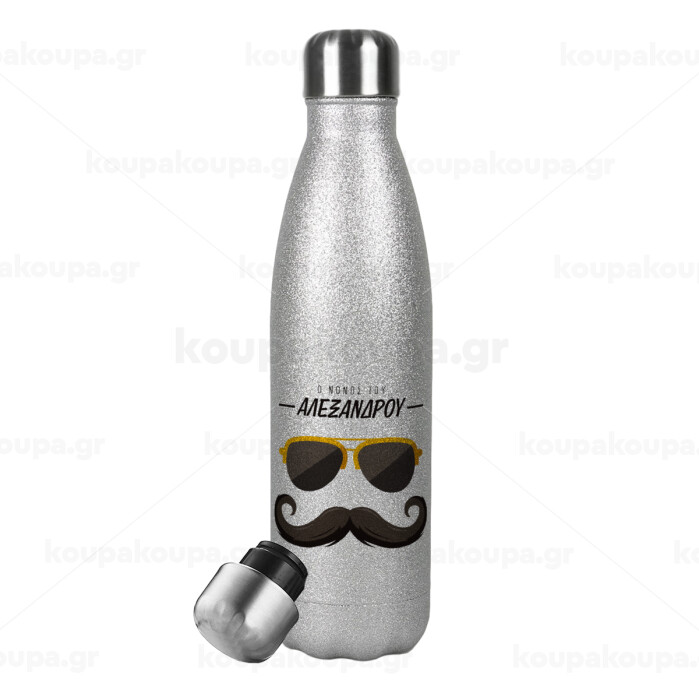 Ο νονός μου, μουστάκι με γυαλιά, Metallic Glitter Silver Thermos Flask (Stainless steel), double-walled, 500ml
