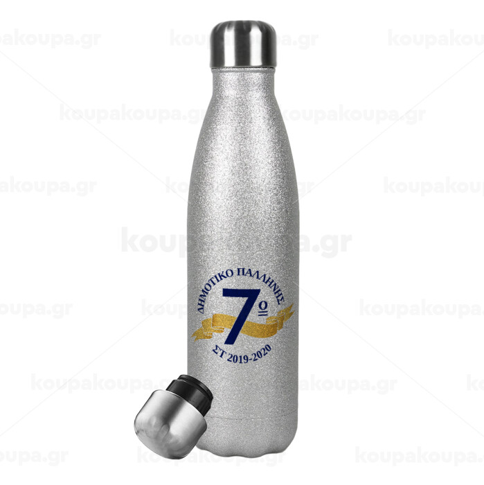 Σχολική μπλε με κορδέλα, Metallic Glitter Silver Thermos Flask (Stainless steel), double-walled, 500ml