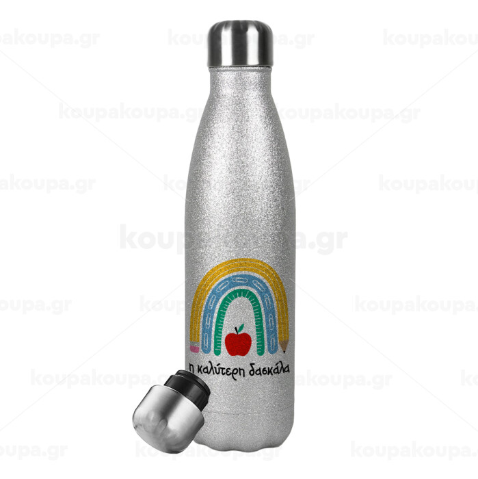 Η καλύτερη δασκάλα, Metallic Glitter Silver Thermos Flask (Stainless steel), double-walled, 500ml