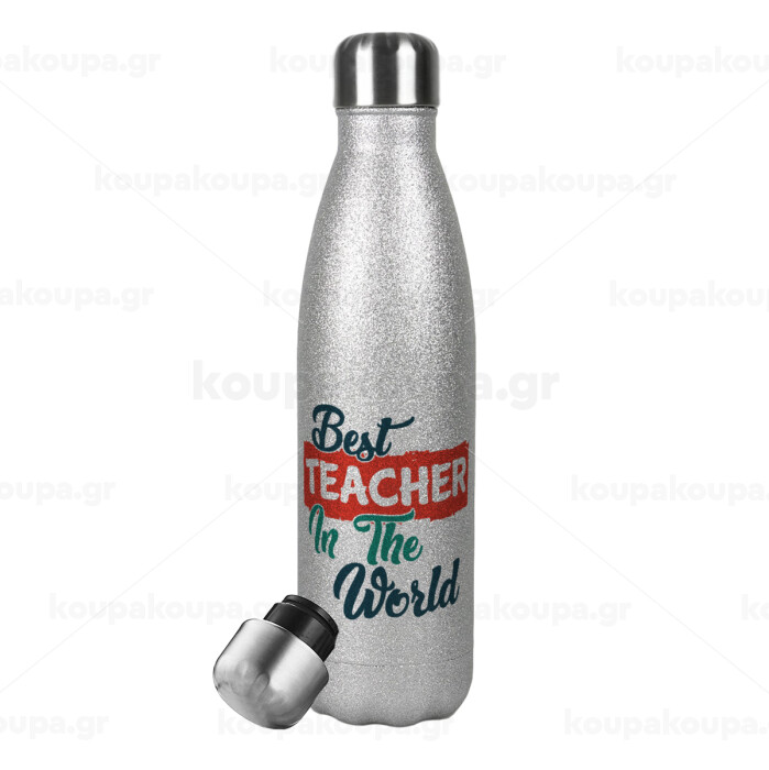 Best teacher in the World!, Metallic Glitter Silver Thermos Flask (Stainless steel), double-walled, 500ml