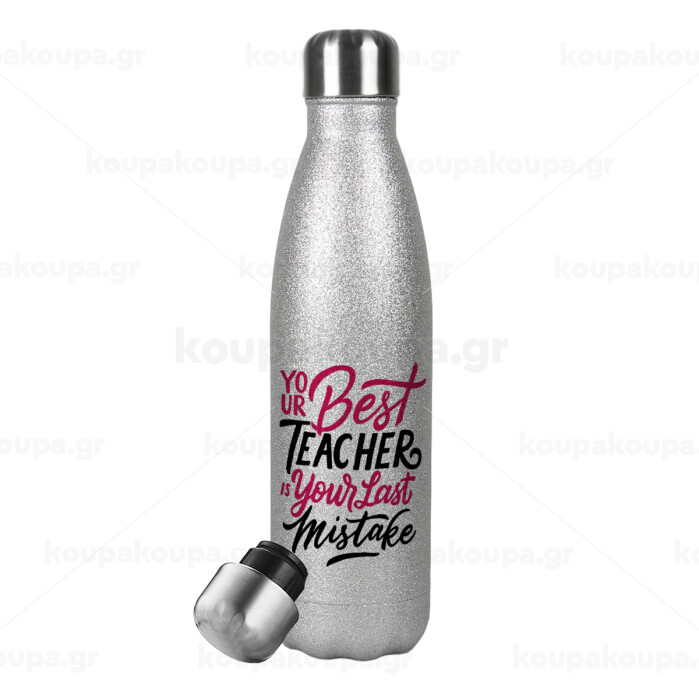 Typography quotes your best teacher is your last mistake, Metallic Glitter Silver Thermos Flask (Stainless steel), double-walled, 500ml