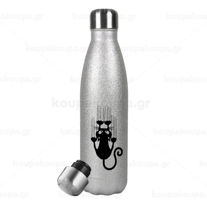 Cat scratching, Metallic Glitter Silver Thermos Flask (Stainless steel), double-walled, 500ml