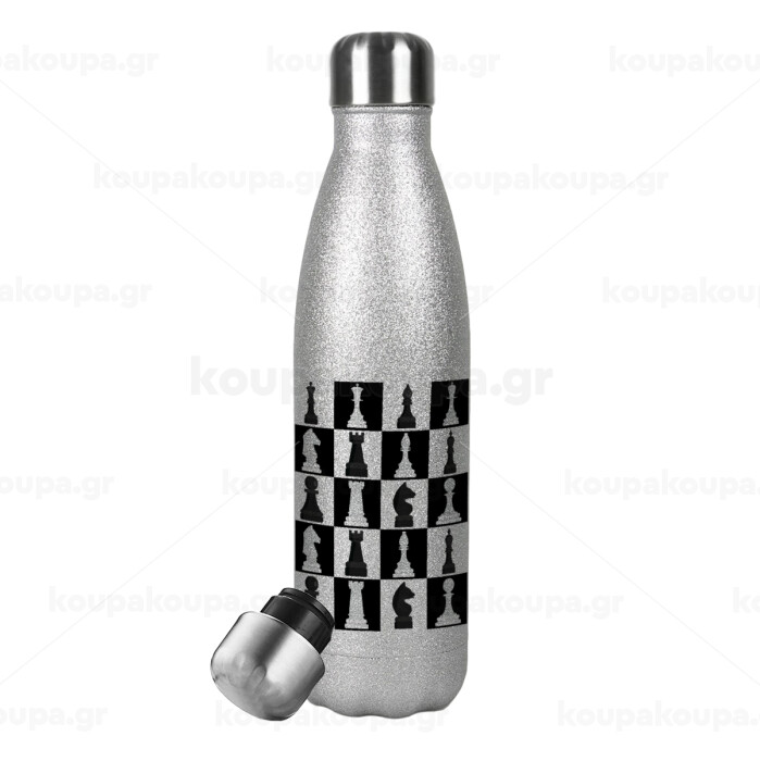 Chess set, Metallic Glitter Silver Thermos Flask (Stainless steel), double-walled, 500ml