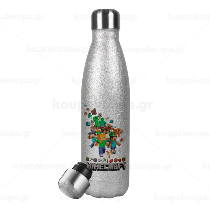 Minecraft adventure, Metallic Glitter Silver Thermos Flask (Stainless steel), double-walled, 500ml
