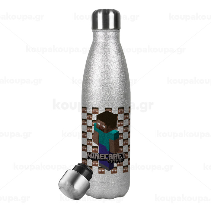Minecraft herobrine, Metallic Glitter Silver Thermos Flask (Stainless steel), double-walled, 500ml