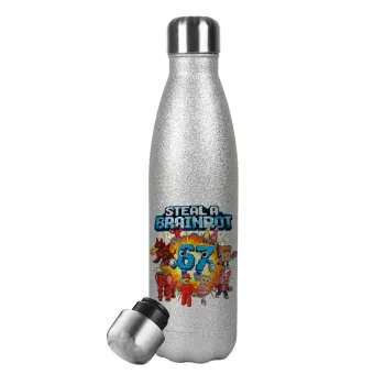 Steal a Brainrot 67 Roblox Style, Metallic Glitter Silver Thermos Flask (Stainless steel), double-walled, 500ml