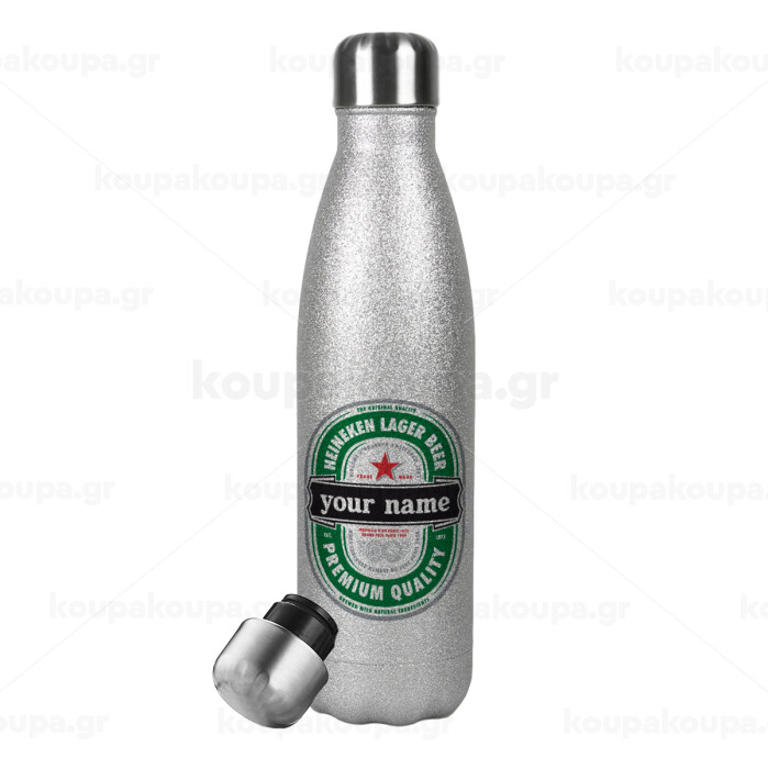 Heineken with name, Metallic Glitter Silver Thermos Flask (Stainless steel), double-walled, 500ml