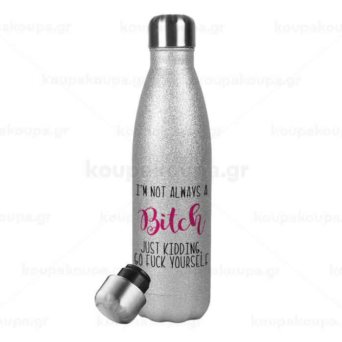 I'm not always a bitch, just kidding go f..k yourself , Metallic Glitter Silver Thermos Flask (Stainless steel), double-walled, 500ml