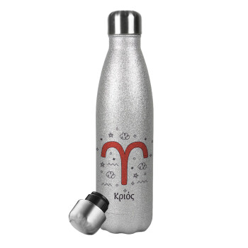 Ζώδια Κριός, Metallic Glitter Silver Thermos Flask (Stainless steel), double-walled, 500ml