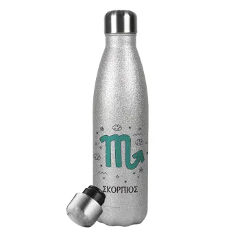 Ζώδια Σκορπιός, Metallic Glitter Silver Thermos Flask (Stainless steel), double-walled, 500ml