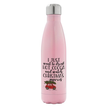 I just want to drink hot cocoa and watch christmas movies mini cooper, Metal mug thermos Pink Iridiscent (Stainless steel), double wall, 500ml