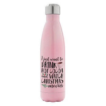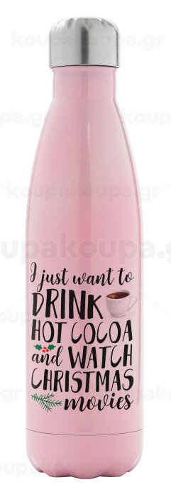 I just want to drink hot cocoa and watch christmas movies, Metal mug thermos Pink Iridiscent (Stainless steel), double wall, 500ml