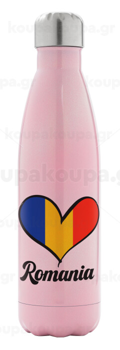 Romania flag, Metal mug thermos Pink Iridiscent (Stainless steel), double wall, 500ml