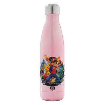 Ash Ketchum & Pikachu, Metal mug thermos Pink Iridiscent (Stainless steel), double wall, 500ml