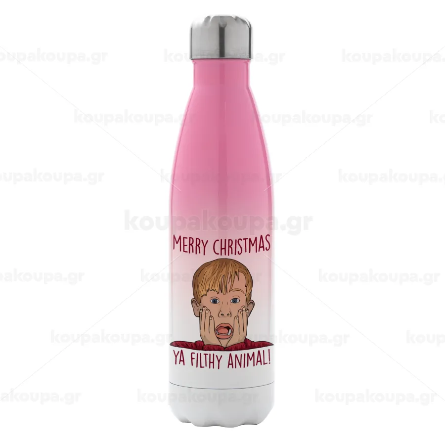 home alone, Merry Christmas ya filthy animal, Metal mug thermos Pink/White (Stainless steel), double wall, 500ml