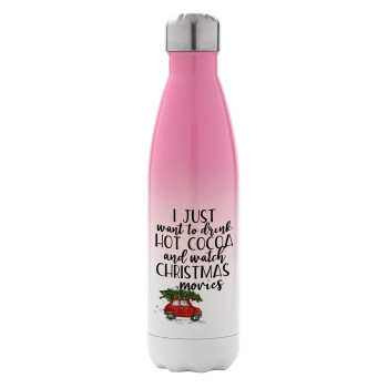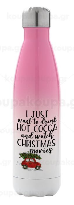 I just want to drink hot cocoa and watch christmas movies mini cooper, Metal mug thermos Pink/White (Stainless steel), double wall, 500ml