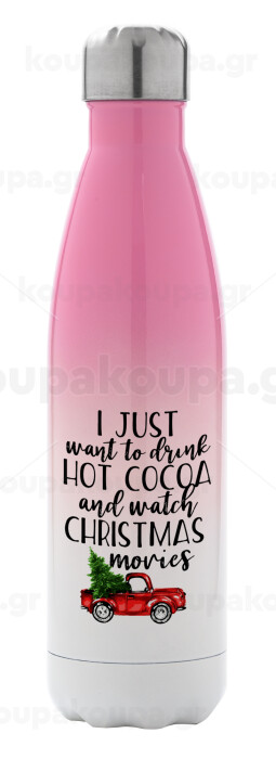 I just want to drink hot cocoa and watch christmas movies pickup car, Metal mug thermos Pink/White (Stainless steel), double wall, 500ml